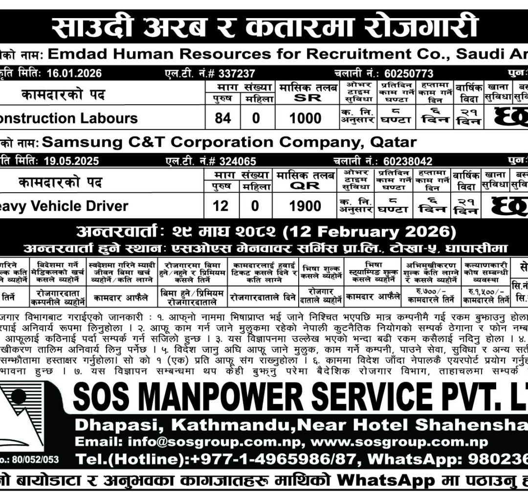 SOS Manpower Services Pvt. Ltd. is one of the leading Manpower Recruitment Agencies in Nepal, registered in 1996 and duly authorized by the Department of Foreign Employment, Ministry of Labor of the Government of Nepal to carry out recruitment of Nepalese manpower for foreign employment under license no. 80/052/053.