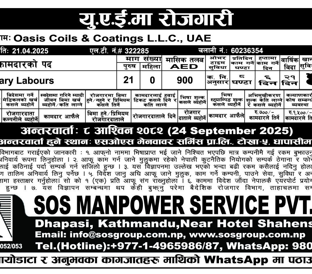 SOS Manpower Services Pvt. Ltd. is one of the leading Manpower Recruitment Agencies in Nepal, registered in 1996 and duly authorized by the Department of Foreign Employment, Ministry of Labor of the Government of Nepal to carry out recruitment of Nepalese manpower for foreign employment under license no. 80/052/053.